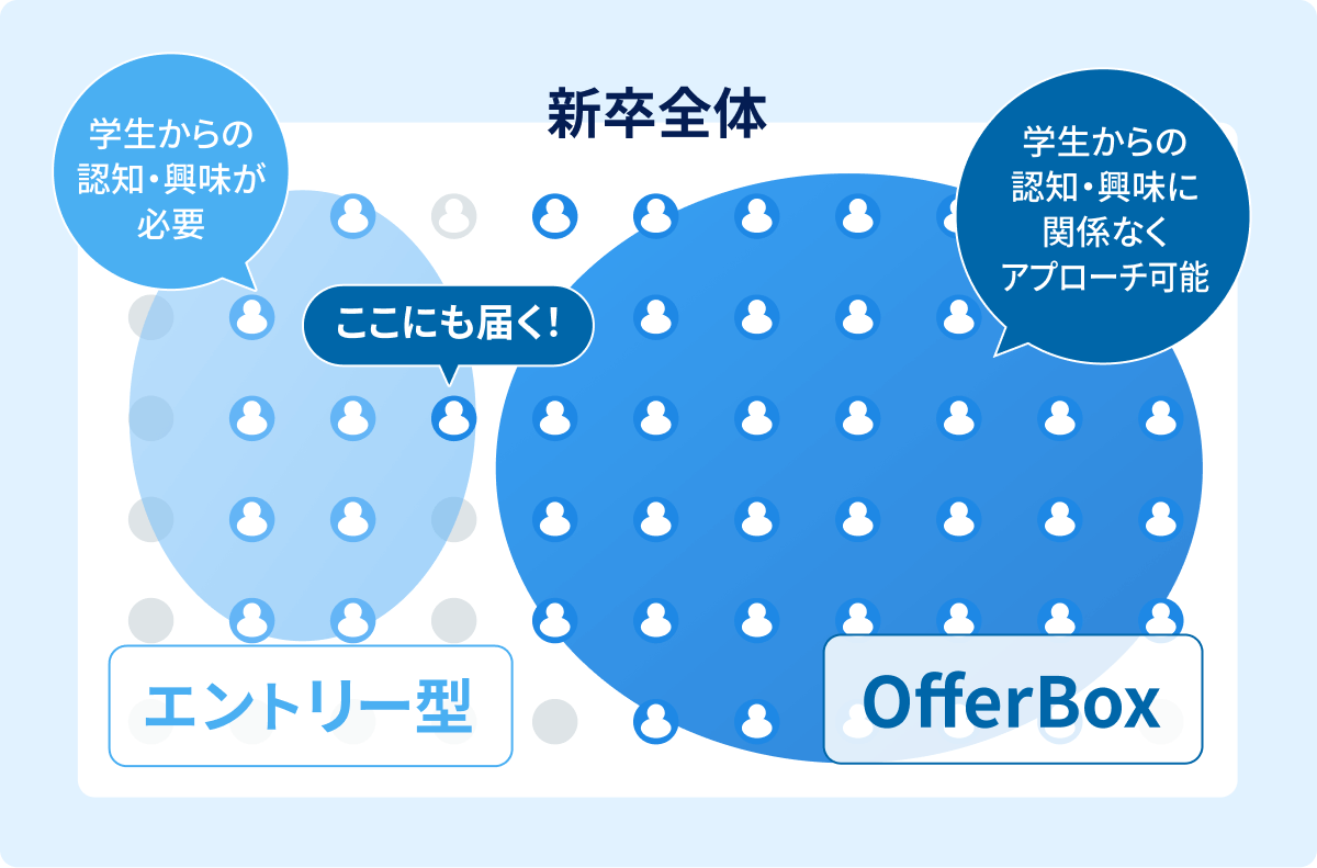 OfferBoxは、知らない企業と出会いたい学生が7割、実際にオファーで志望業界が変わった学生が6割以上というデータがあります。